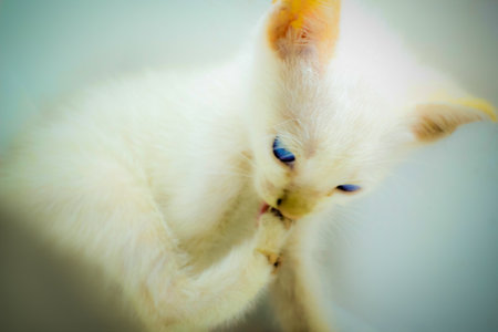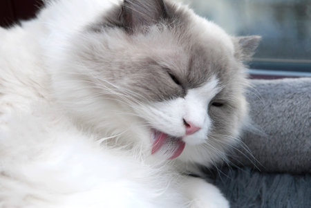 A white ragdool cat cleaning her fur by licking by tongue. Close up. Shallow Depth of Field. SDF.