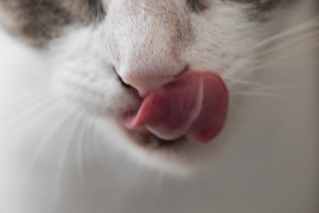 Cat tongue close-up. Cat pet licking nose