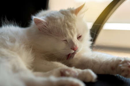 Portrait of a white cat with tongue sticking out, close up