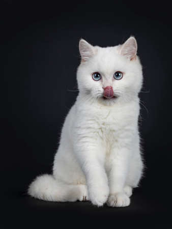 Cute red silver shaded cameo point British Shorthair sitting facing front, looking at the camera with blue eyes and licking his nose, Isolated on black background.