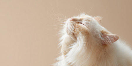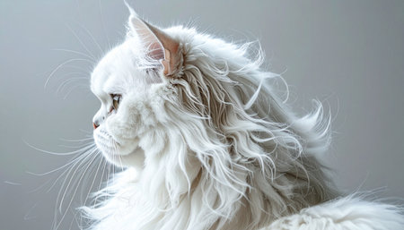 A stunning portrait of a majestic long-haired cat, captured in a serene profile view. Its luxurious, wavy white fur catches the soft light, highlighting its elegant and pensive expression against a simple, clean background. This image evokes a sense of calm, grace, and quiet beauty.