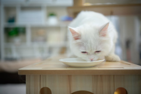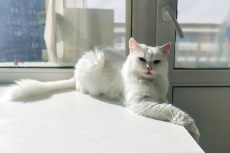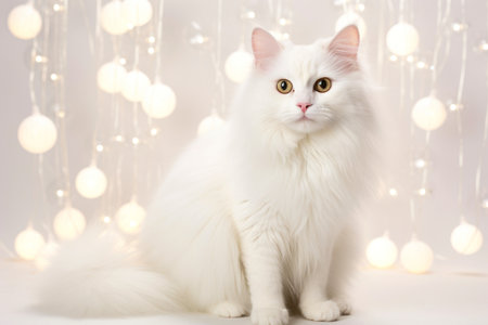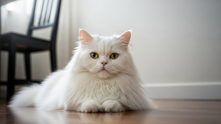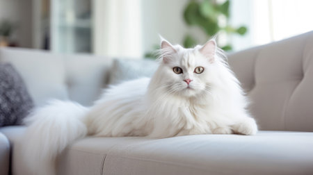 A close-up view presents a pristine white cat with fluffy fur, gazing directly at the viewer. The image showcases soft textures and natural illumination, suggesting an indoor environment. This image could be used for various commercial or editorial purposes related to pets or domestic animals.