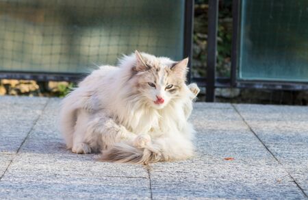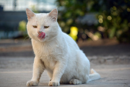 Cute white cat sitting on the ground and licking his lips.