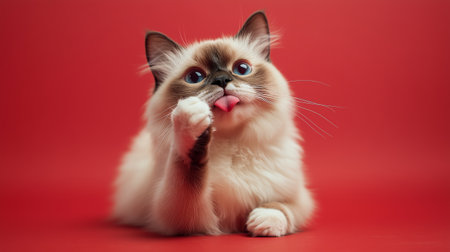 Fluffy cat playfully licking its paw against a vibrant red background during a cozy indoor moment