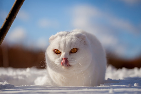 White cottish Fold cat portrait in winter field