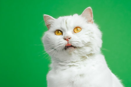 Cute portrait of white furry cat licks oneself on green chromakey background. Studio photo. Luxurious isolated domestic kitty.
