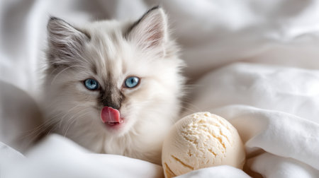 A charming fluffy kitten with striking blue eyes sits next to a scoop of vanilla ice cream, extending its tongue in delight. Ideal for evoking feelings of innocence and joy.
