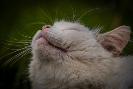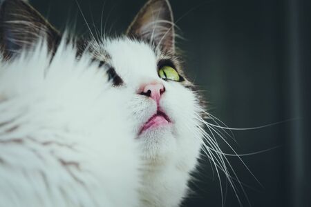 Close up cat mouth. Pretty white cat looking up