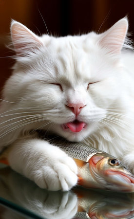 Cute white cat lying on the glass table and eating a fish