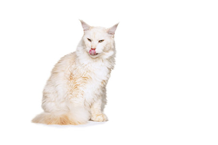 Full-length portrait of beautiful cream color cat, big fluffy Maine Coon cat sitting on floor isolated on white studio background.