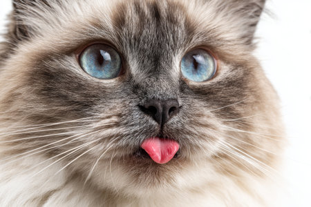 Blue eyed cat with fluffy fur sticking out tongue, close up portrait with white background showing playful expression