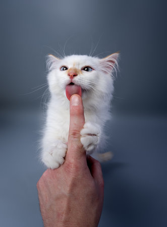 cute white siberian kitten licking finger of human hand on gray studio background