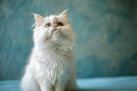 White persian cat on a blue background. Selective focus.