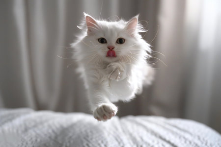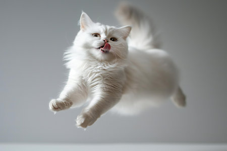 Cute white persian cat jumping and having fun on grey background