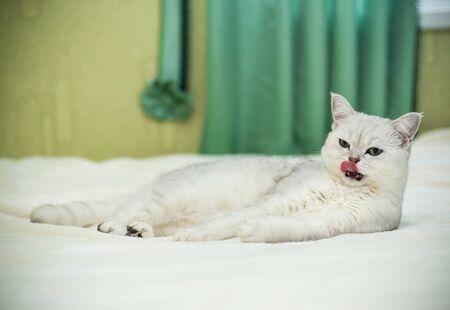White lop-eared cat washes his face. The cat licks its paw while lying on the bed. Pink rough tongue of a cat close-up. Clean Scottish fold cat.