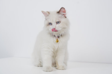Studio portrait of a ragdoll cat licking her nose, sitting against a white background
