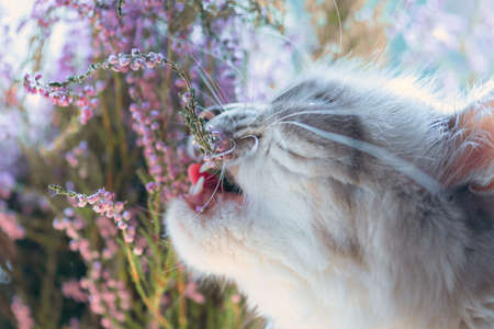 Siberian Neva Masquerade cat tasting purple heather bush blossoms. Cheek and heather twig in cats mouth are in camera focus