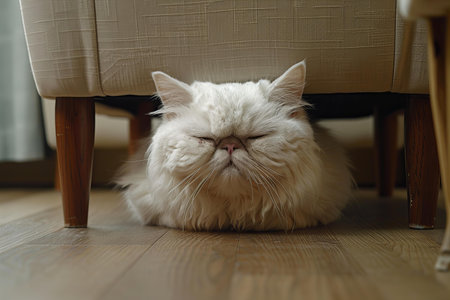 A fluffy white Persian cat sitting on a dark wooden floor with a chair in the background