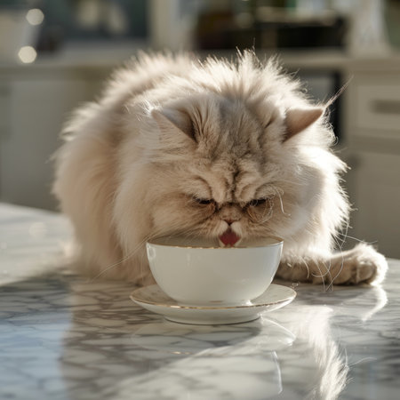 Majestic photorealistic persian cat sitting on kitchen counter with 48mp resolution