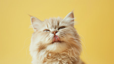 A cute and hungry Persian cat eating and licking its lips with tongue. Isolated on a light yellow pastel background.