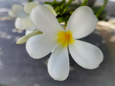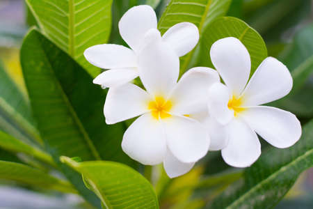 Frangipani flower (Plumeria alba) with green leaves on blurred background. White flowers with yellow at center. Health and spa background. Summer spa concept. Relax emotion. White flower blooming.