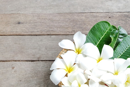 Closeup Plumeria or Frangipani Tropical flowers on wood table, selective focus