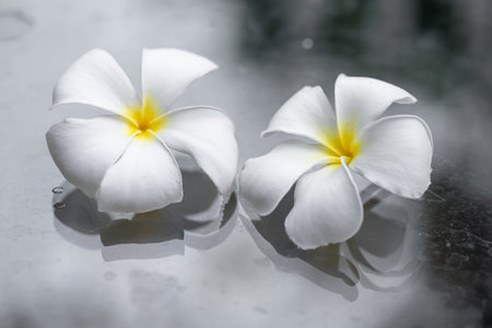 closeup white and yellow plumeria on granite background, nature, decoration, relax, copy space