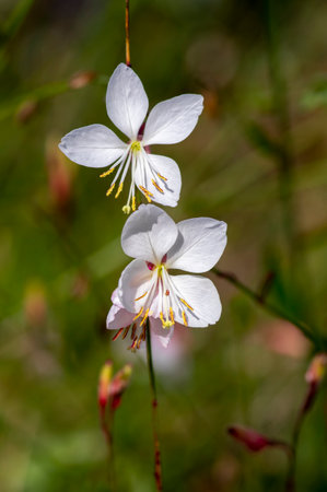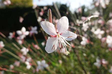 Tender white Gaura lindheimeri flowers blossoming on flower bed on sunny summer day. Beauty in nature.