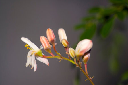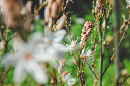 Fragile white and yellow flowers of Anthericum ramosum, star-shaped, growing in a meadow in the wild, blurred green background, warm colors, bright and sunny summer day.