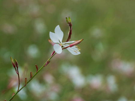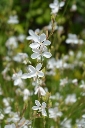 White Gaura or Oenothera lindheimeri blooming at flowerbed flowers and buds close-up, selective focus, shallow DOF.