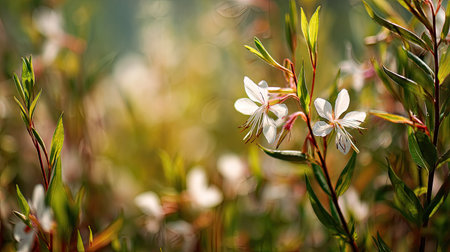 The Gaura in spring, fresh green leaves, soft sunlight filtering, vibrant atmosphere full of vitality, natural textures, serene mood.