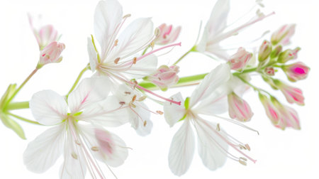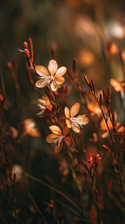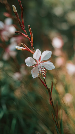Delicate white flowers with crimson stems create a whimsical and ethereal scene. Represents purity, beauty, and fragility. Ideal for nature, spring, or wedding themes.