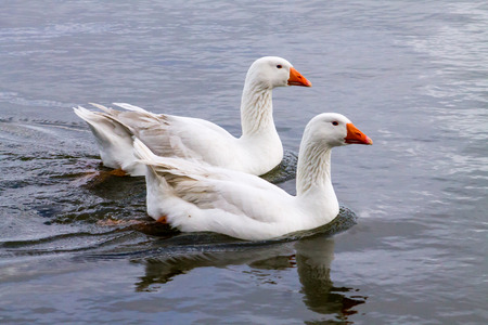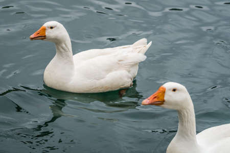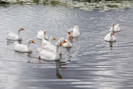 Domestic geese swim in the water. A flock of white beautiful geese in the river.