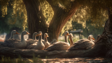 A beautiful summer scene with ducks swimming in a pond generated by artificial intelligence