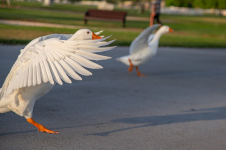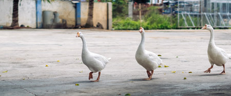 Several white geese walking together in small city. Craned necks. Summer mood, live close to