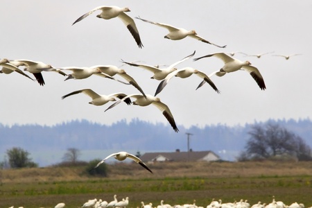 Snow Geese Flying Over Countryside Close Up Skagit County Washington