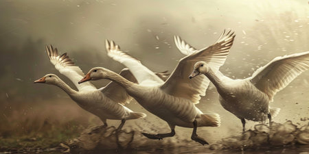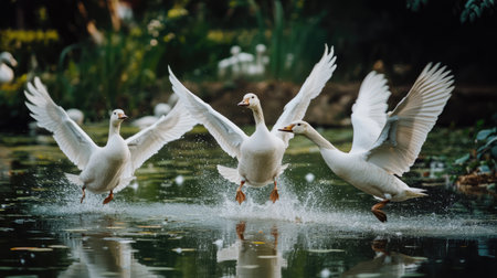 Three elegant white geese leap from a peaceful pond, spreading their wings in motion while splashes surround them, embodying nature's beauty.