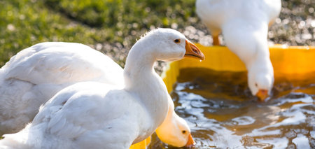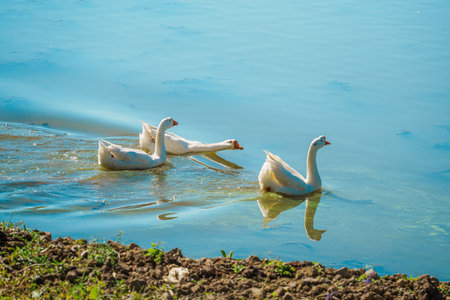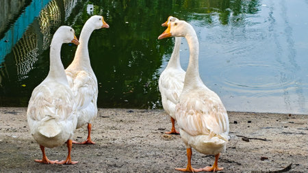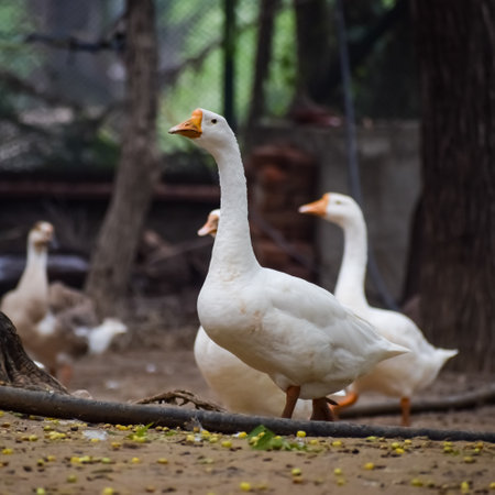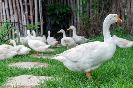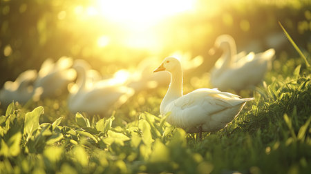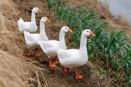 white geese thriving on a tranquil farm, embodying the beauty and serenity of rural life.