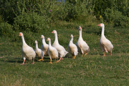 a group of white domestic geese floating on the surface of the river to the shore, a summer day
