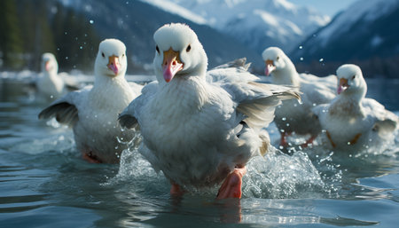 A captivating scene of white birds in mid-flight over shimmering water, creating splashes and illustrating natural beauty and wildlife grace.