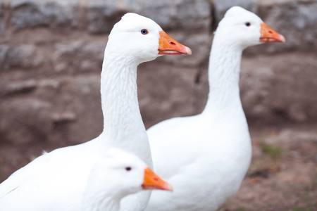 Domestic white geese on the farm. Flock of fattening geese, on the rural farm for the production of meat and goose feathers. Flock of white domestic geese