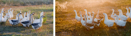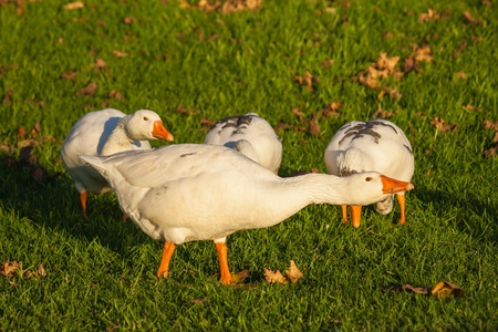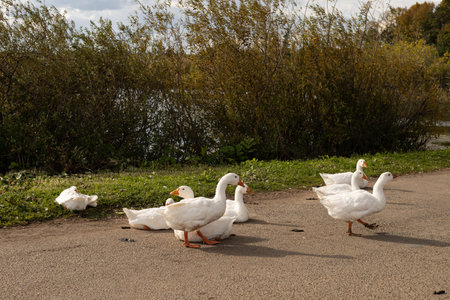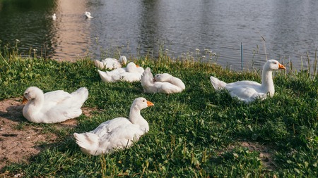 a herd of beautiful white geese grazing on green lawns on the background of the river. Selective focus macro shot with shallow DOF