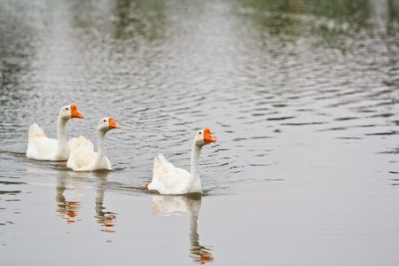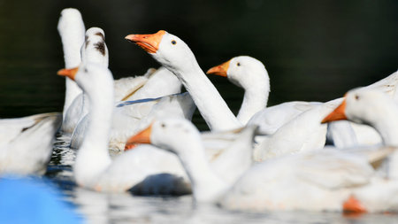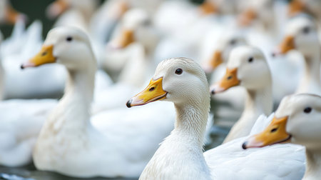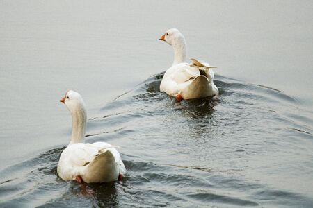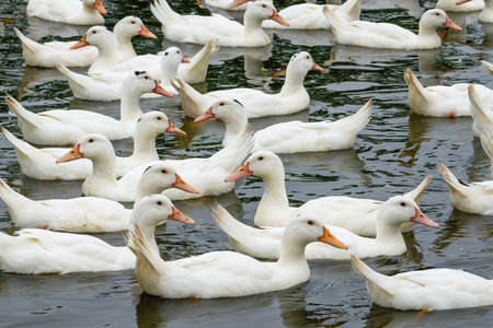 Group of white ducks swimming in the lake. Shallow depth of field.