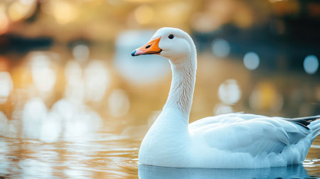 A stunning white goose gracefully swims in calm water, illuminated by warm sunlight. This serene scene captures the beauty of nature and wildlife in a tranquil setting. Perfect for showcasing wildlife conservation or inspiring nature lovers.