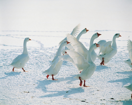 Screaming domestic birds. Malevolent geese opened large and orange beaks. Generate AI