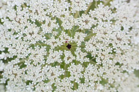 View of meadow white flower of Aegopodium podagraria L. called ground elder, herb gerard, bishop's weed, goutweed, gout wort, snow-in-the-mountain. Small white flowers as romantic wedding background