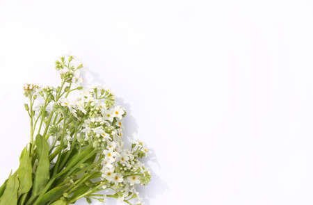 Bouquet of the wild flowers on soft paper background. Forget-me-not plant with blue and white flowers. Copy space. Floral card, poster, banner design.
