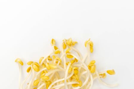Mung beans (Vigna radiata) sprouted for food with small roots and rudiments of leaves on white background. Concept of diet, vegetarianism, vegan, healthy products and proper nutrition. copyspace.