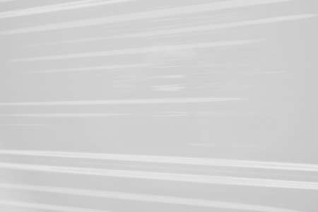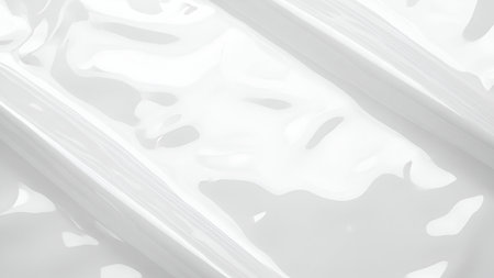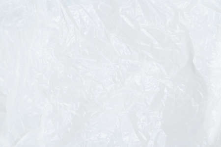 Wrinkled plastic wrap on white color background. Crumpled transparent plastic cellophane. Reflecting light and shadow on creases and folds in plastic surface. Texture overlay effect template