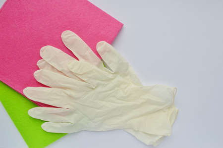 Cleaning rag in various colors and white rubber gloves on white background. Towels day